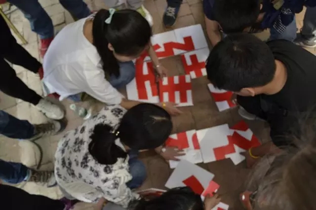 藏匿字塊的成員正將其中一塊藏進(jìn)宣傳板
